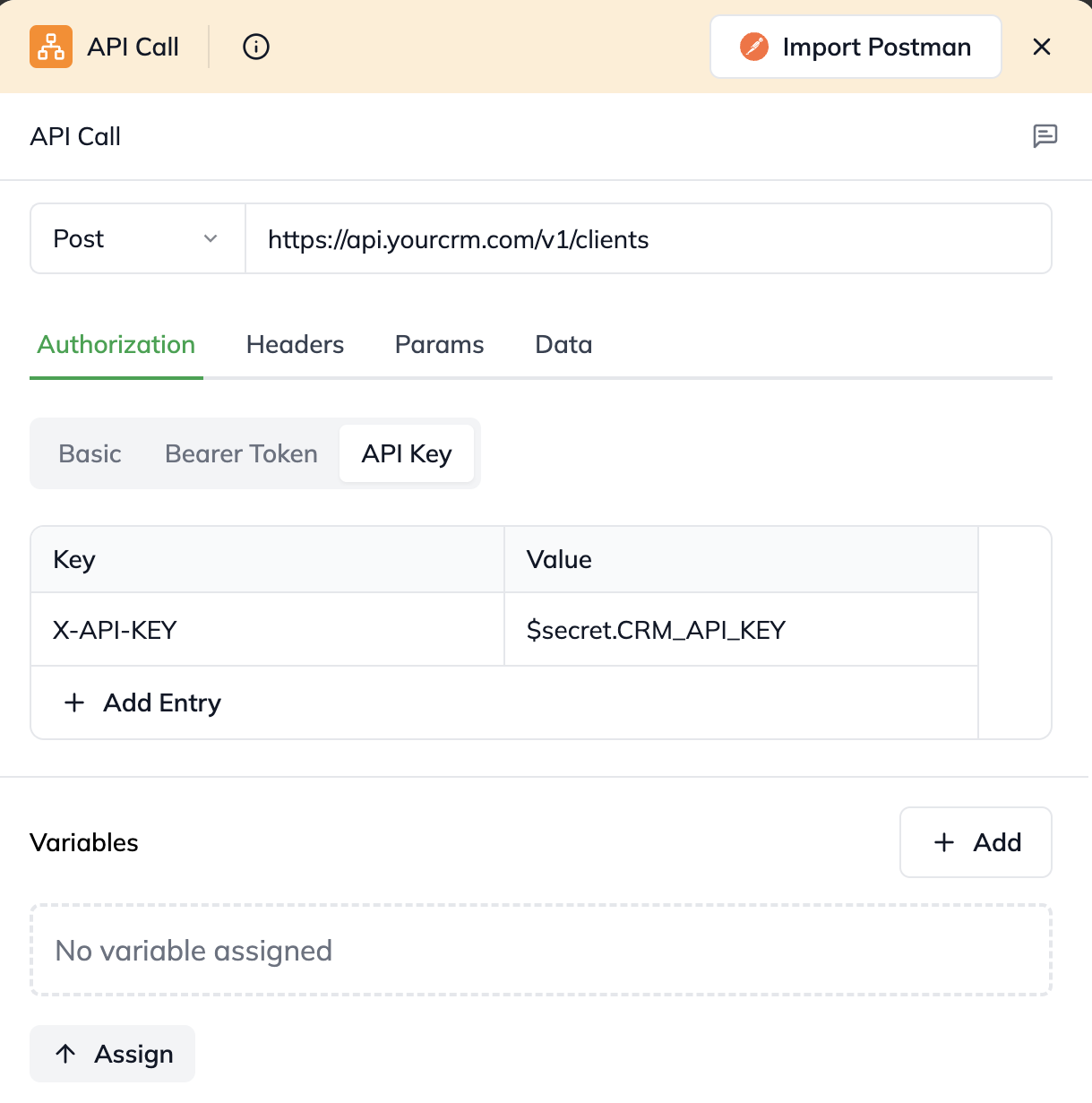 Setting up secure authorization using a Secret variable for your API key.