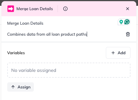 You can optionally give it a Name (e.g., "Merge Loan Details") and a Description (e.g., "Combines data from all loan product paths") to improve workflow clarity. There are no other fields to fill in.