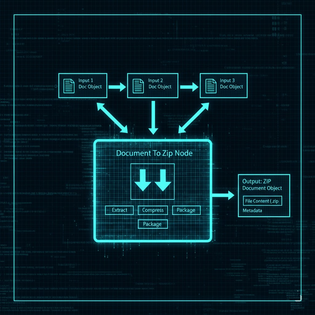 Only the resulting zipDocumentId is surfaced to downstream nodes; raw file paths are never exposed.